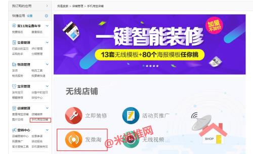 卖家中心——店铺管理——手机淘宝店铺——无线店铺——发微淘