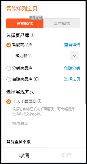 3、选择智能商品库、千人千面展现以及想要展示的宝贝个数;