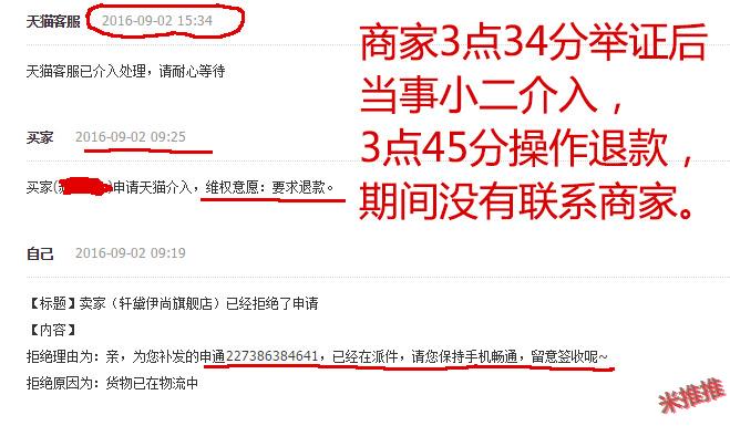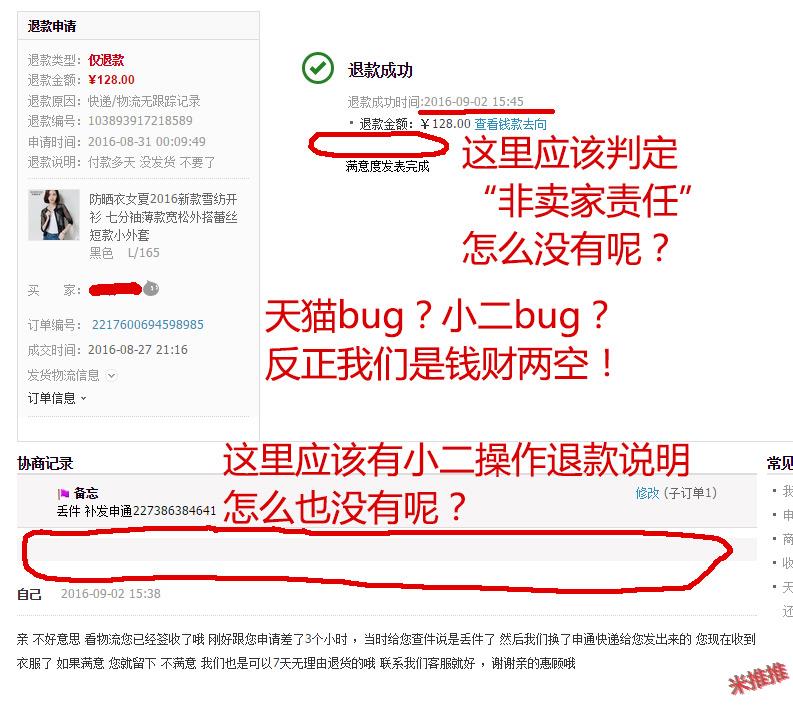 事情很简单,买家申请了仅退款,申请了小二介入,之后签收了商品。就在我们联系买家按照”退货退款”处理之时,半路杀出了天猫小二,不看举证材料,不看售后详情,在没有联系我们(抑或邮件通知)的情况下不分青红皂白给操作了退款!操作了退款!操作了退款! 天呐!毫无人性啊!正值G20峰会普天下放假之时,这位小二是不是因加班辛苦过度,把火气乱撒到我们商家身上来了?!这件事,虽然只是128元的小事,却反映了小二维护公平正义的相反一面,让我们商家心寒!我们强烈要求这位涉事小二出面道歉,并赔偿128元的损失!