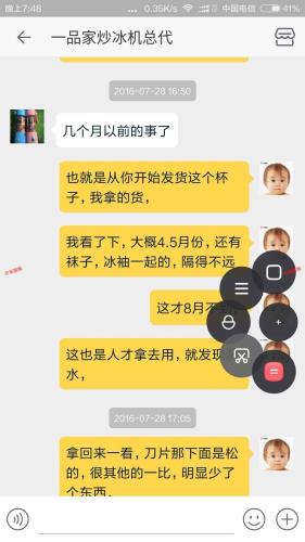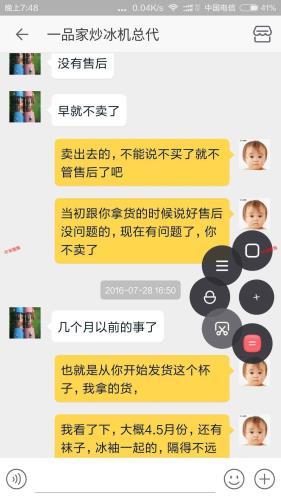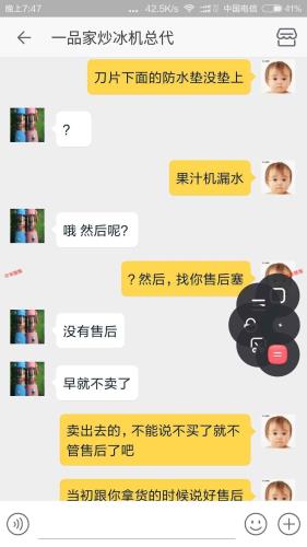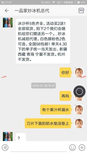 这种商家真的是无良到底,淘宝协商处理了一个多月也没个结果,一开始是不卖了,不售后,到最后直接把我微信拉黑,旺旺不理!!!这样就行了吗,淘宝背的就是你这样商家的黑锅!!亏得是淘宝还背的不亦乐乎!!真正是~~~大家看看吧,每个人一辈子不会只是看中这一个果汁机的价值,值钱的是个人的人格,连自己都不注重自己信誉的人还有什么价值可言呢!!!