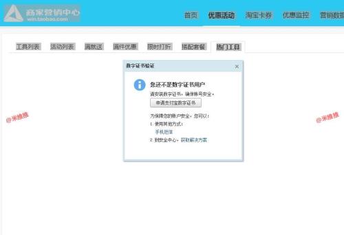 各位朋友,我要在营销中心促销管理中更改最低折扣,点击促销管理,优惠活动,热门工具,提示申请支付宝证书,我已按操作申请,手机验证安装了数字证书,但是点击热门工具,还是要提示申请数字证书,换了几台电脑都是这样,有了IE、360、搜狗、谷歌浏览器,都是这样,现在想各位朋友求助。
